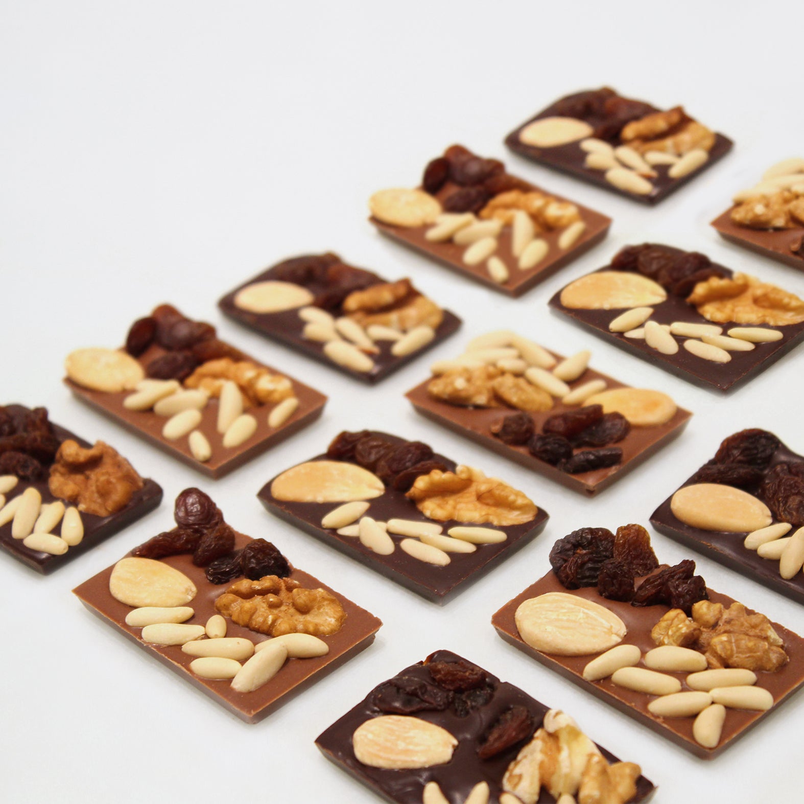 Bombones de temporada hechos con frutos y pasa. Disponibles en chocolate negro y con leche. ¡Y variado!